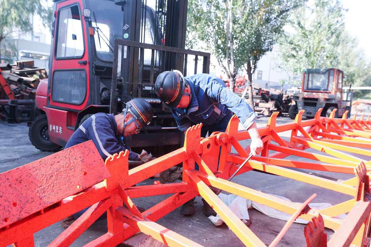 在该公司机修车间外,机电信息中心职工司德军(左一)正在与一名职工合力拆卸二运皮带机架,拆卸完成后的架子将被转运到公司设备库维护保养,待井下有需要后重新“返岗”。
