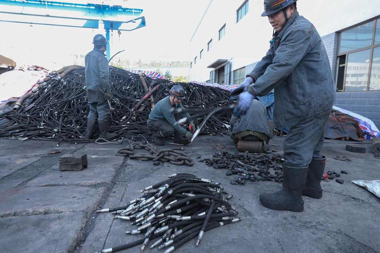 在该公司综采设备库,采煤区职工王北京(左二)他们正在对回收升井的高压胶管、液压支架配件进行归拢分类,挑取有用的堆放到综采设备库,既节省了材料费,又在采煤工作面有需要时派上用场
