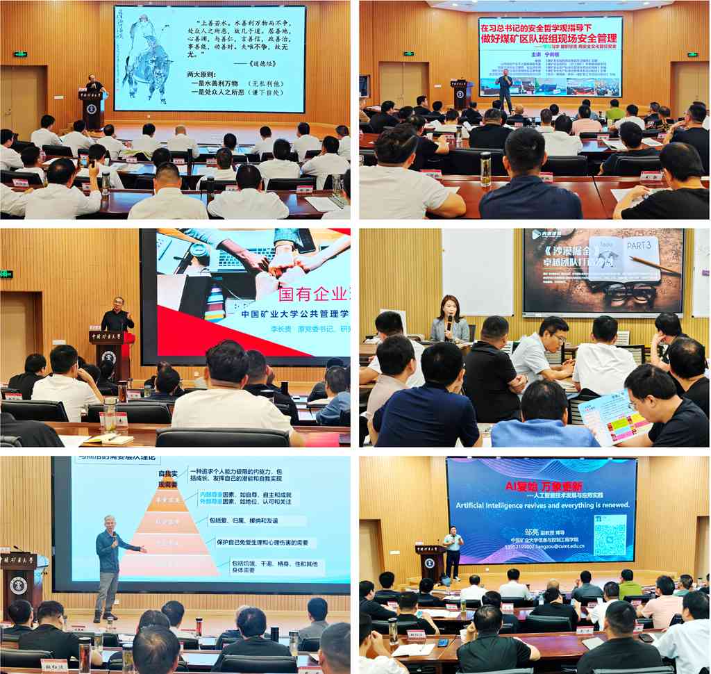 本次培训创新采用“课堂授课+实践研学”“双轨教学”模式,课程设置深度对接钱营孜煤矿管理实际与发展需求,既夯实理论基础,又强化实践应用,助力管理人员实现从“知”到“行”的全面提升。在课堂授课环节,培训班特邀校内外领域专家量身定制课程,打造高质量教学内容:中国矿业大学高级工商管理硕士(EMBA)主讲教师胡琼教授,结合多年EMBA教学经验,以《基层管理人员工作方法与沟通技巧》为题,系统传授管理沟通艺术与团队协作策略,帮助学员提升跨部门协同效率;国家应急管理部安全技术培训中心特聘专家宁尚根教授,以习近平总书记安全哲学观为指导,深入解析煤矿区队班组安全管理实务,从制度建设、风险防控等维度助力筑牢安全生产“第一道防线”;矿大博士生导师李长贵教授聚焦思政教育与安全管理深度融合,分享国家级课题转化的实践经验,为管理人员提供“党建+安全”的创新管理思路;中国经济全球化研究中心研究员、矿大硕士生导师胡霞副教授创新采用“沙漠掘金”沙盘推演教学法,通过模拟资源分配、风险决策、团队协作等真实管理场景,将抽象的管理理论转化为可直接应用的实践工具;矿大硕士生导师张卫华、邹亮副教授分别围绕“基层管理者领导力建设”与“人工智能赋能煤矿产业”展开专题讲解,既阐述了领导力培养的科学路径,又展现了前沿技术推动传统煤矿转型升级的创新方向。
