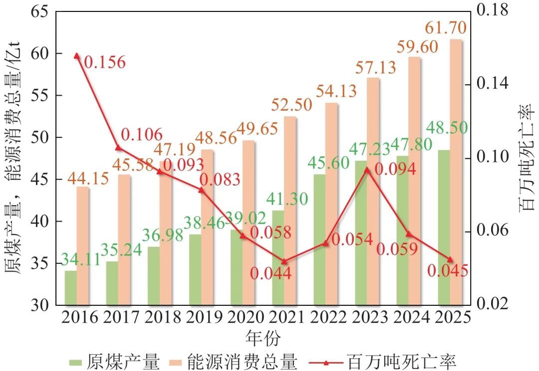 图1 2016—2025 年我国原煤产量、能源消费总量与煤矿百万吨死亡率变化趋势