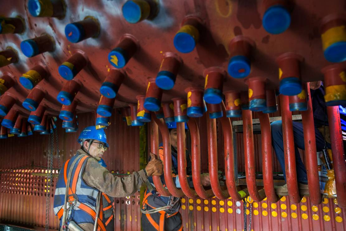 中能建建筑集团淮南洛河电厂四期项目施工现场,七号锅炉管道安装区域,集箱壁上密集悬垂的穿墙管格外醒目