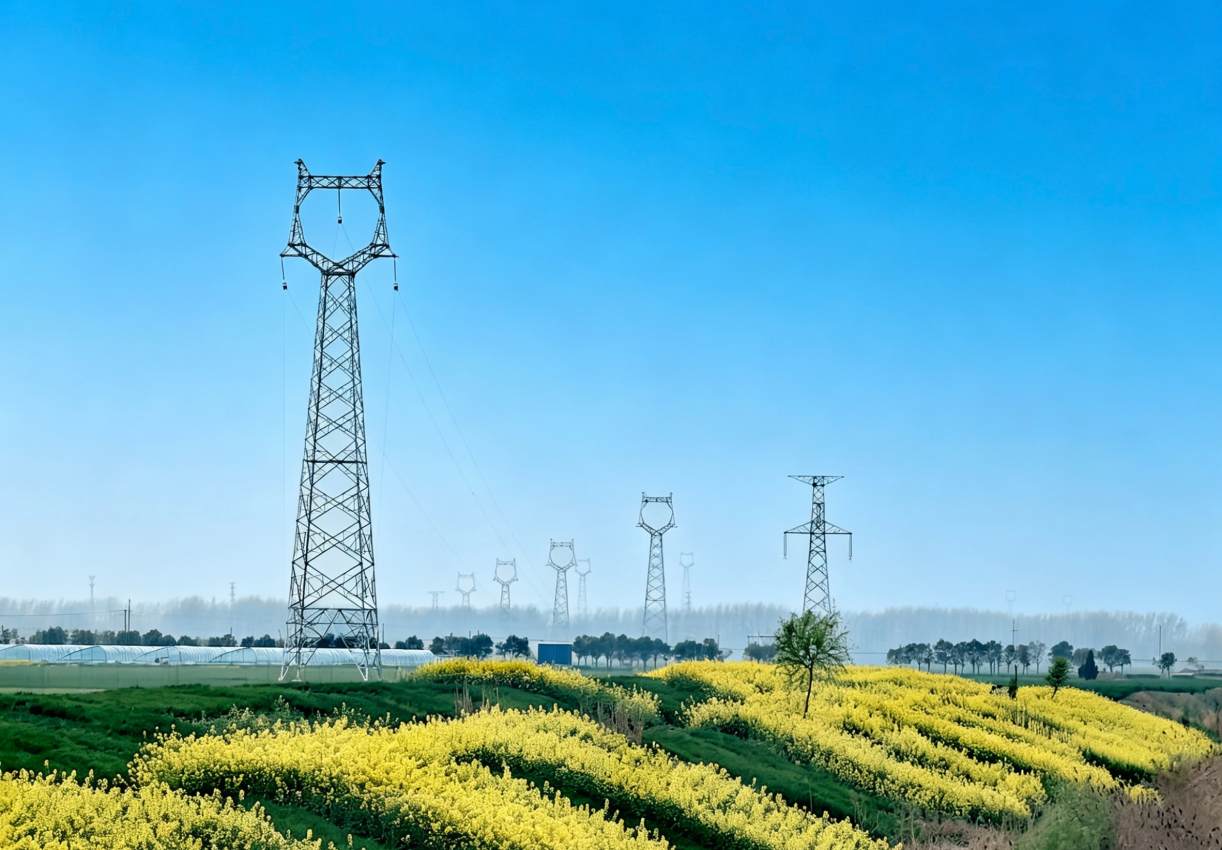 春日,油菜花海铺金叠浪,银灰铁塔巍然林立,沿沃野向远方绵延,为城市发展输送不竭动力。