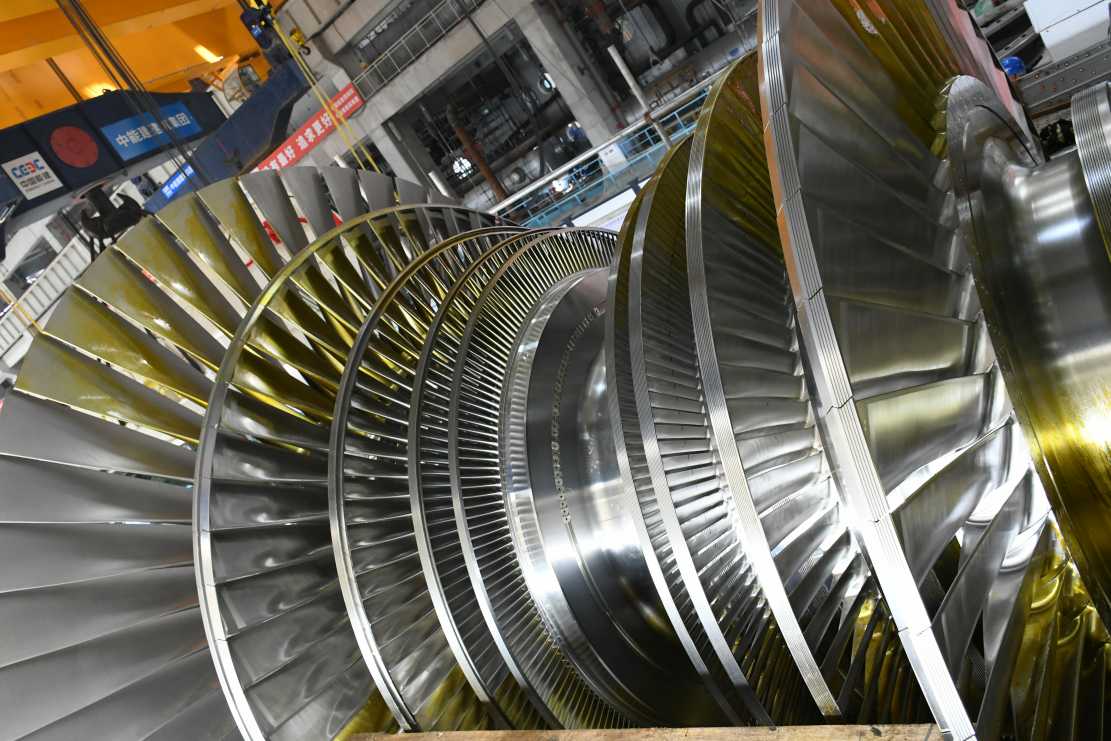 银灰色汽轮机转子平稳静置车间(闫凯林/摄)
